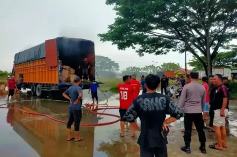 Akibatnya, arus lalu lintas di jalur tersebut tersendat parah. Sejumlah kendaraan melaju perlahan bahkan terpaksa berhenti karena ketinggian air yang membahayakan.