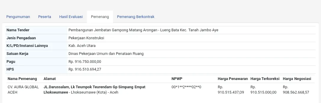 Berdasarkan informasi yang dihimpun, proyek tersebut memiliki pagu anggaran sekitar Rp916.750.000 dan dimenangkan oleh CV Aura Global Aceh yang beralamat di Jalan Darussalam, Kota Lhokseumawe, Provinsi Aceh. Namun, kondisi fisik jembatan yang tampak kusam dan sejumlah bagian plasteran yang terlihat tidak rapi memantik tanda tanya besar.