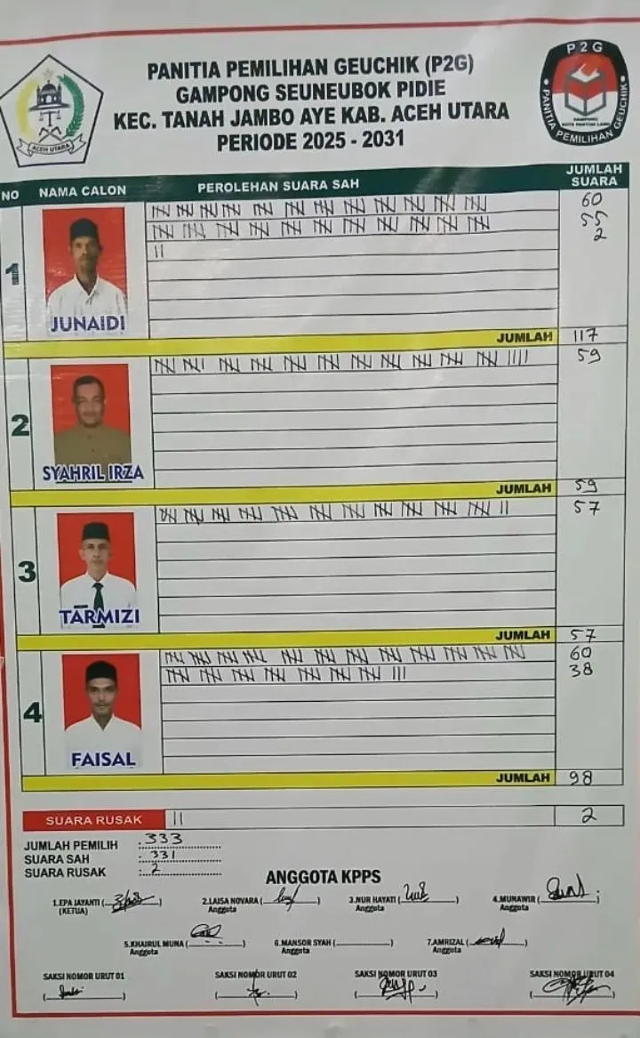 Setelah proses penghitungan suara yang berjalan tertib, hasil rekapitulasi yang diumumkan oleh P2G mengungkap kemenangan gemilang bagi Junaidi. Calon nomor urut 1 ini berhasil meraih jumlah suara terbanyak, mengungguli tiga kandidat lainnya. Junaidi mengumpulkan 117 suara sah, yang setara dengan 35,35% dari total suara sah yang masuk.