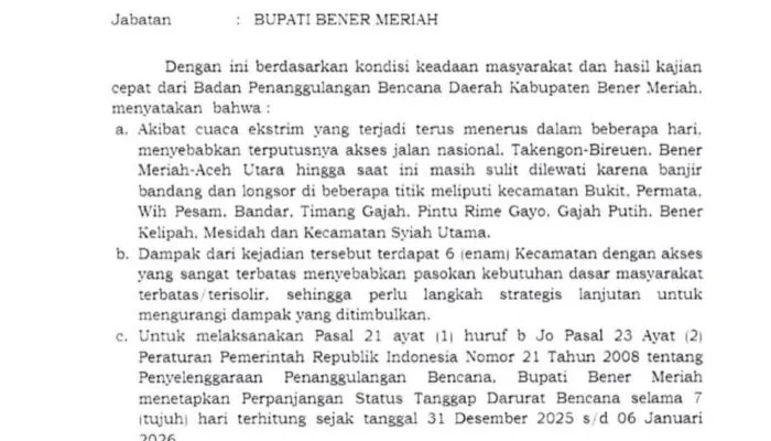 Perpanjangan status ini dilakukan dengan mempertimbangkan kondisi di lapangan serta kebutuhan penanganan darurat yang masih berlangsung di sejumlah wilayah terdampak bencana di Kabupaten Bener Meriah.